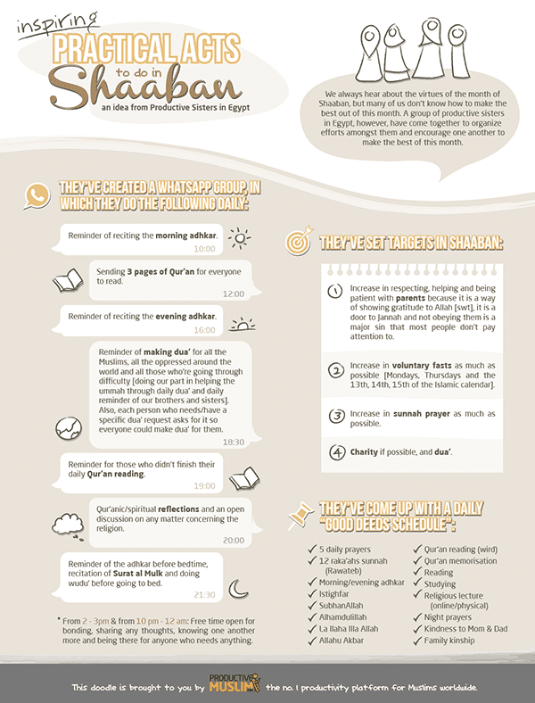 This is what the group of sisters decided to do to productively revive their faith in Shaaban. If you’ve benefited from this plan, print and/or share the doodle with your family and friends. And tell us, what other practical tips do you have? How are you getting yourself ready for Ramadan? Let us know in the comments section.