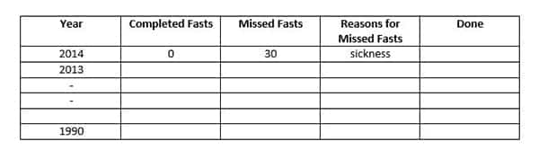 For me, it would be 30. So in the column for “Completed Fasts”, I put 0; for “Missed Fasts”, I put 30 and for “Reasons for Missed Fasts”, I put sickness.