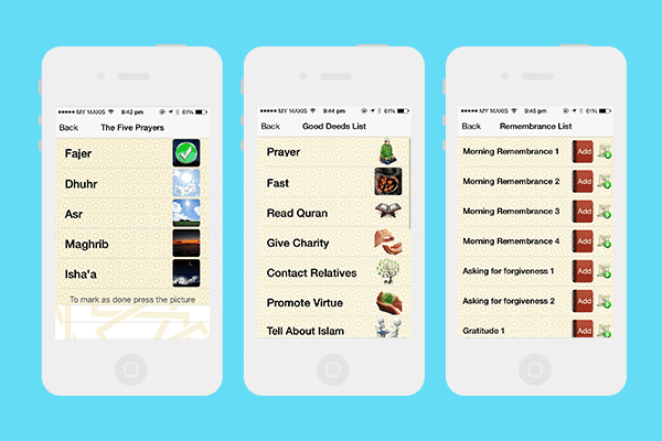 Among other actions, you are given the choice to track your five fardh (obligatory) prayers; the different sunnah (recommended optional) prayers such as Duha, Witr etc.; different deeds such as fasting, reciting the Qur’an, and even a collection of 25 adhkar (repeated devotional remembrances) included in the app in Arabic with both their translations and transliterations!