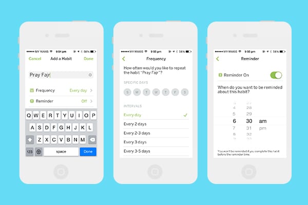 The frequency option is super flexible: You can choose specific days from Monday through Sunday, or any other combinations that you can think of. The reminder notifications and badges too are an absolute plus for the times where you are so engrossed in work that you overlook the time for certain prayers such as Duha.