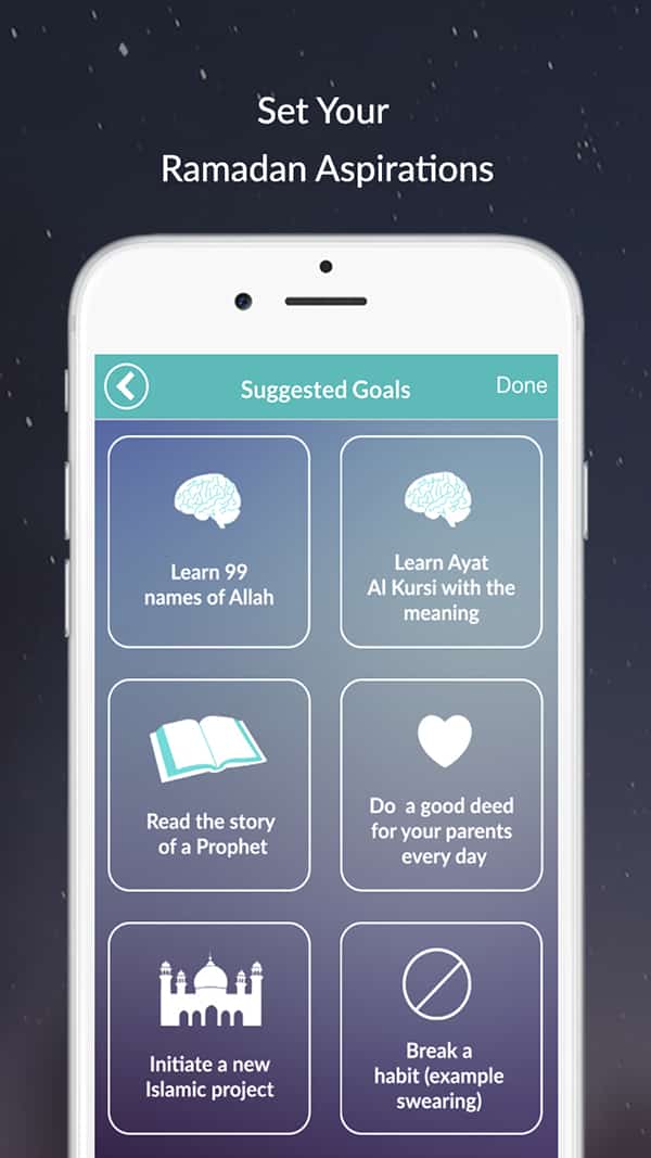 OK, now this is cool! Before getting into the nitty-gritty of the app and its features, it prompts you to set your personal goals and aspirations at the end of the sign-up process. We always learn that for Ramadan to be successful, you must have set goals for the month and work towards them. I love the fact that not only does this app encourage you to do so, but actually provides you with a mini-library of suggested goals in case you can’t think of your own. For example you can choose to memorize the 99 names of Allah ﷻ, to learn a surah or quit a bad habit.