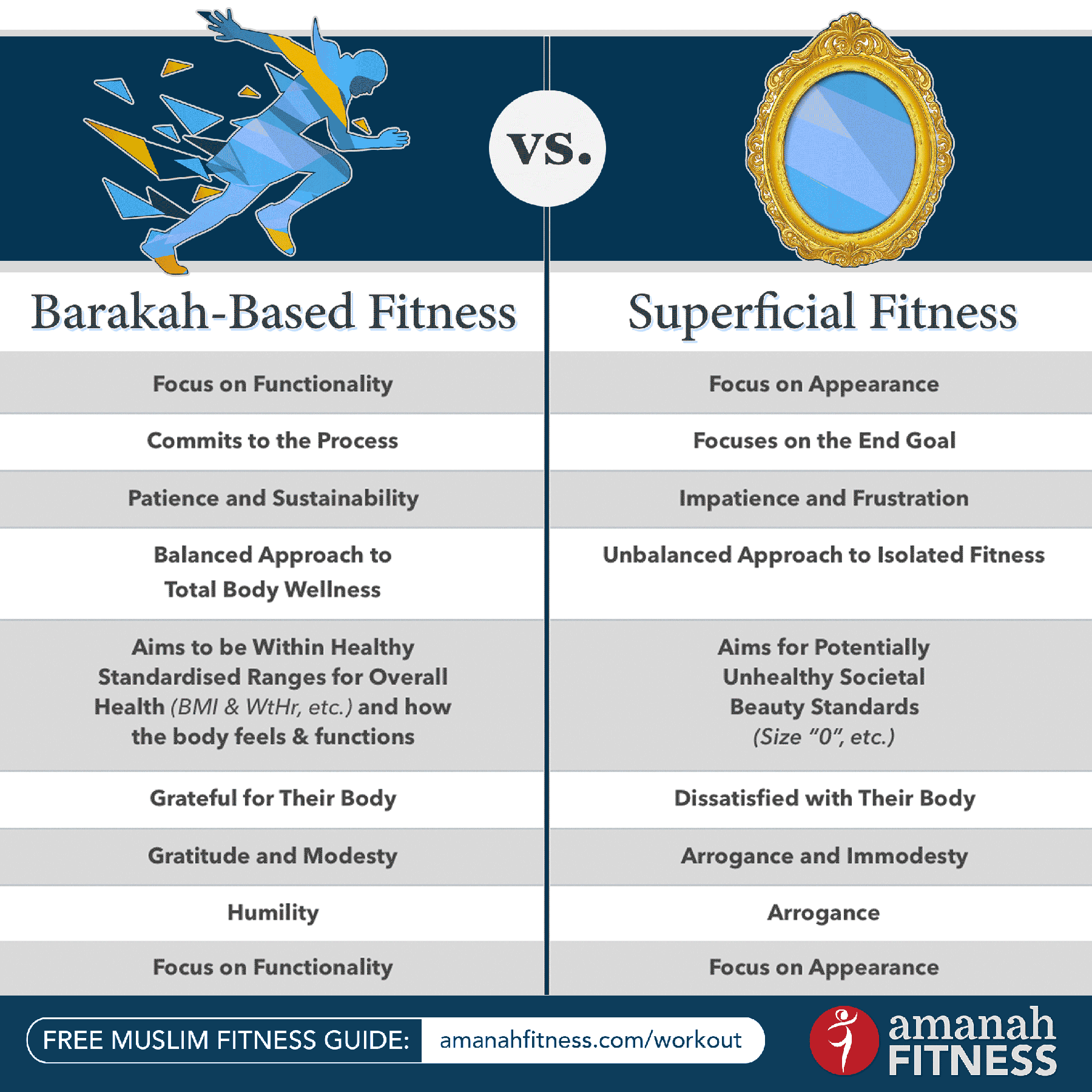 In the following infographic, I compare 8 ways in which someone following a Barakah-based fitness practice differs from someone following trends established by the hyper-sexualized, superficial fitness industry.