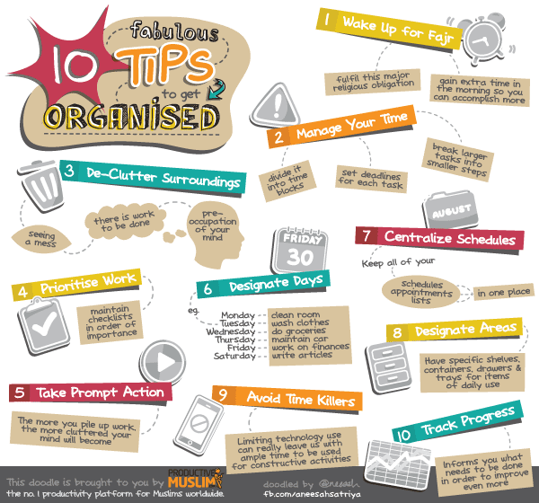 Are you wasting too much time trying to figure out where your things are, or what to do with your day? If so, organization can help you stop wasting time. This doodle is based on the article Ten Fabulous Tips to Get Organised! by Talha Qayyum