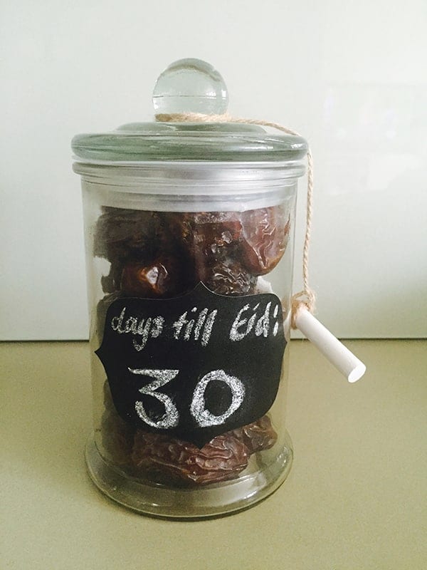 Have children count 30 dates into a jar, and then attach a chalkboard label and piece of chalk with string for the recipient to count down the days till Eid. If Ramadan is only 29 days this year, the recipient can use the remaining date to fulfil the sunnah of eating a date on Eid morning! Your children can create these jars to give to friends and family at the beginning of Ramadan.