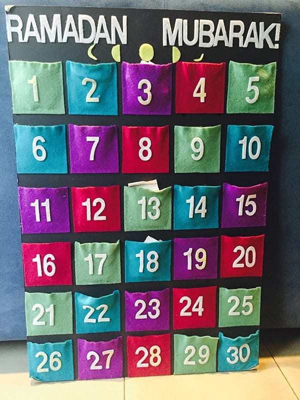 Marking off the days of Ramadan is a lot of fun for kids. The simple calendar I made for my children (felt pieces glued on to a black board) has little pockets, where I put a note with either a sweet or a date for the kids. The notes have changed over the years based on the age and knowledge of my children. When they were very small, the notes just said things like “Allah loves you so much!” and “In Ramadan, adult Muslims don’t eat or drink anything from before sunrise until sunset!”. As they grew older, I put in more advanced lessons or Qur’an verses. If we have guests, I ensure there are enough sweets or dates in the pocket for every child who visits. The children are not allowed to get the note or sweet until Maghrib time, as this helped create a sense of excitement for this time of day, even when they were too young to be fasting. If you’re not keen on making your own calendar, you can buy beautiful handmade silk and wool calendars or even just print these great ones for free, and cross off the days as you go.