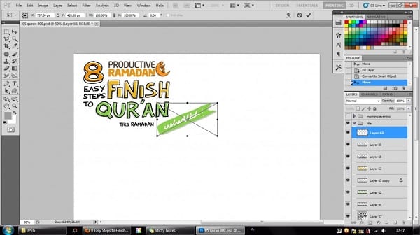 I want to stress the importance of keeping your workspace and layers organised, particularly using Layer Sets and labels. This screenshot shows me converting that green ribbon with text into a Smart Object, a feature in the newer versions of Photoshop. You edit it in a separate file, with the layers in it, so if there are multiple copies of the object in your main canvas, they are updated automatically. Also, smart objects appear as one layer in your main document so that simplifies things. One more point — you can transform (rotate/shrink/flip/etc.) smart objects multiple times and it will re-render itself nicely without going all fuzzy and compressed. However, Smart Objects do significantly increase the file size.