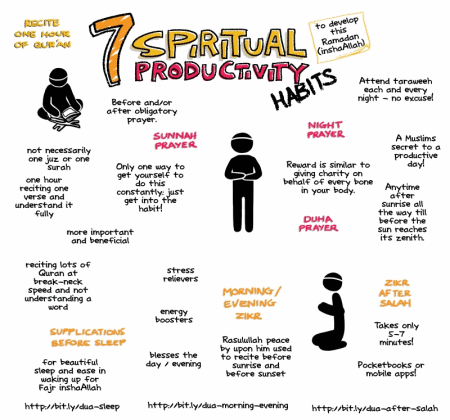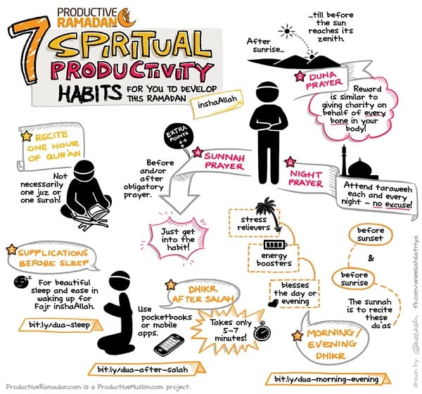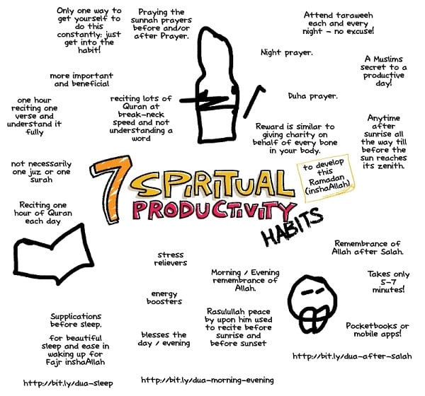 One of the comments from Abu Productive was to discard some chunks from the “Recite one hour of Qur’an” point, so that necessitated a layout overhaul to fill in the gap and make things look balanced again. I still don’t think the overall composition is as nice as the unedited draft. Usually with this “floating” style, the stuff you draw sort of naturally fits like a puzzle the first time around, but it is okay.