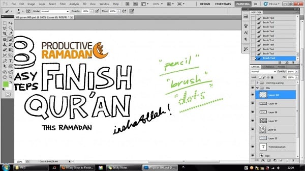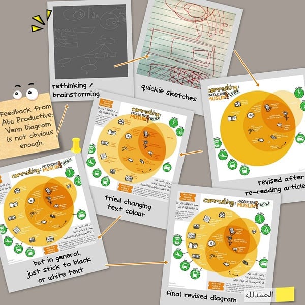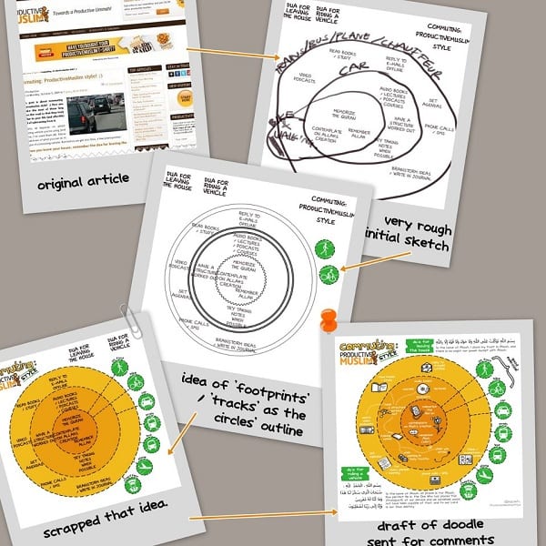 I thought I would write this post in case anybody might be interested in the process behind the informational doodle posters I design for Productive Muslim. It’s not quite a tutorial or guide, because I am just making things up as I go along. Since the bulk of the work is drawing the little graphics/icons, let the video first introduce you to something called a Wacom tablet, which happens to be a drawing tablet: