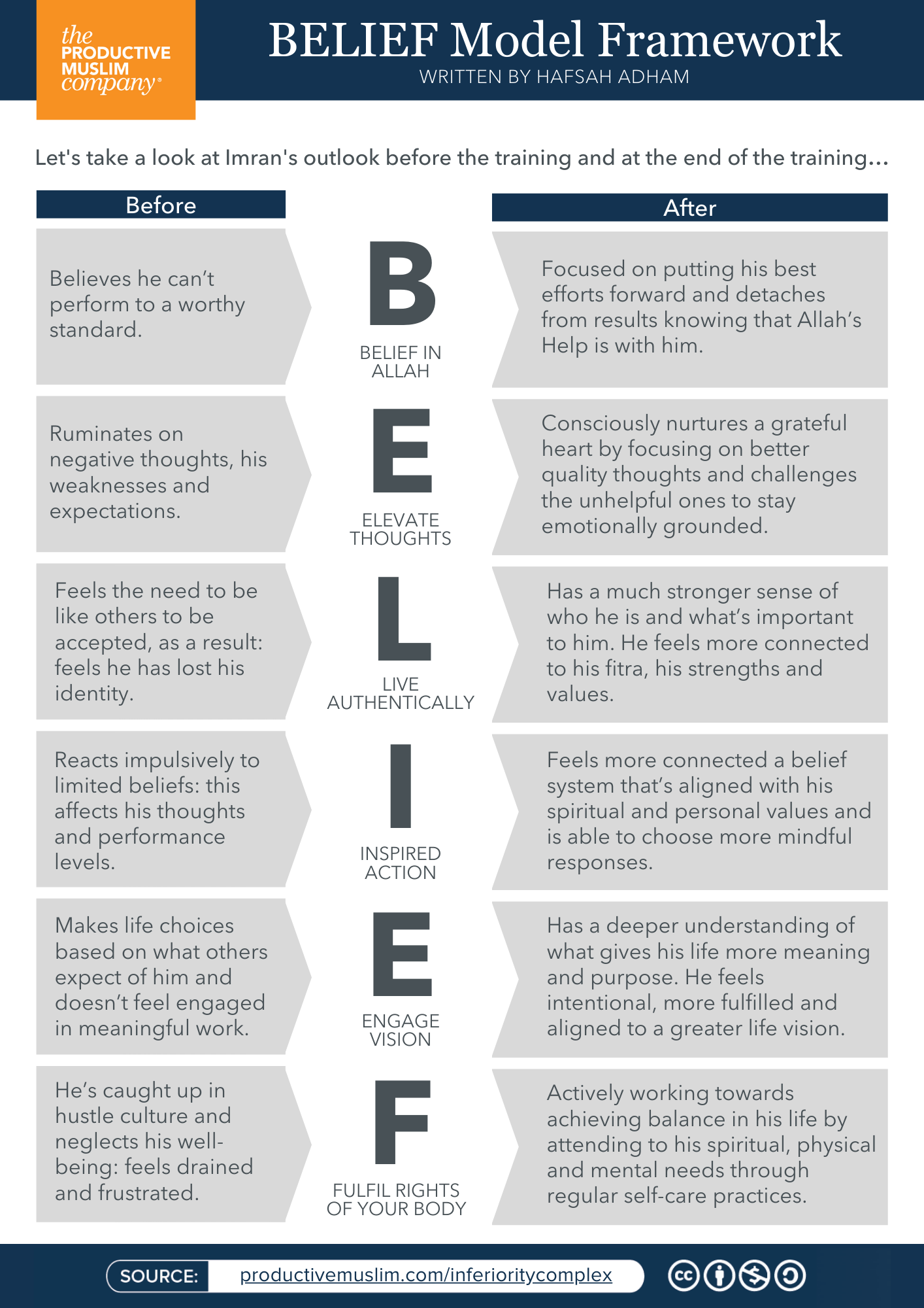 After working his way through the Belief model, Imran is a more confident, healthy, balanced individual who is still ambitiously working towards his life goals but with an active focus of how his work in this world can connect to the next. He’s no longer as concerned with external judgment or trying to fit in; his heart, mind and soul have found contentment in his deen and his feelings of self worth are rooted internally by his connection to Allah.