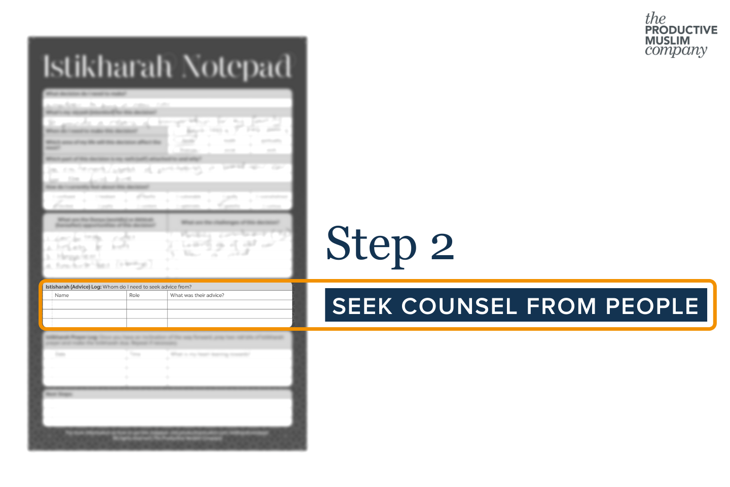 This section of the Istikharah Notepad ensures that you a) seek shura from at least three people in your circle (feel free to seek istisharah from more people if you want) and b) capture their shura, so you have a log of what advice they gave you.