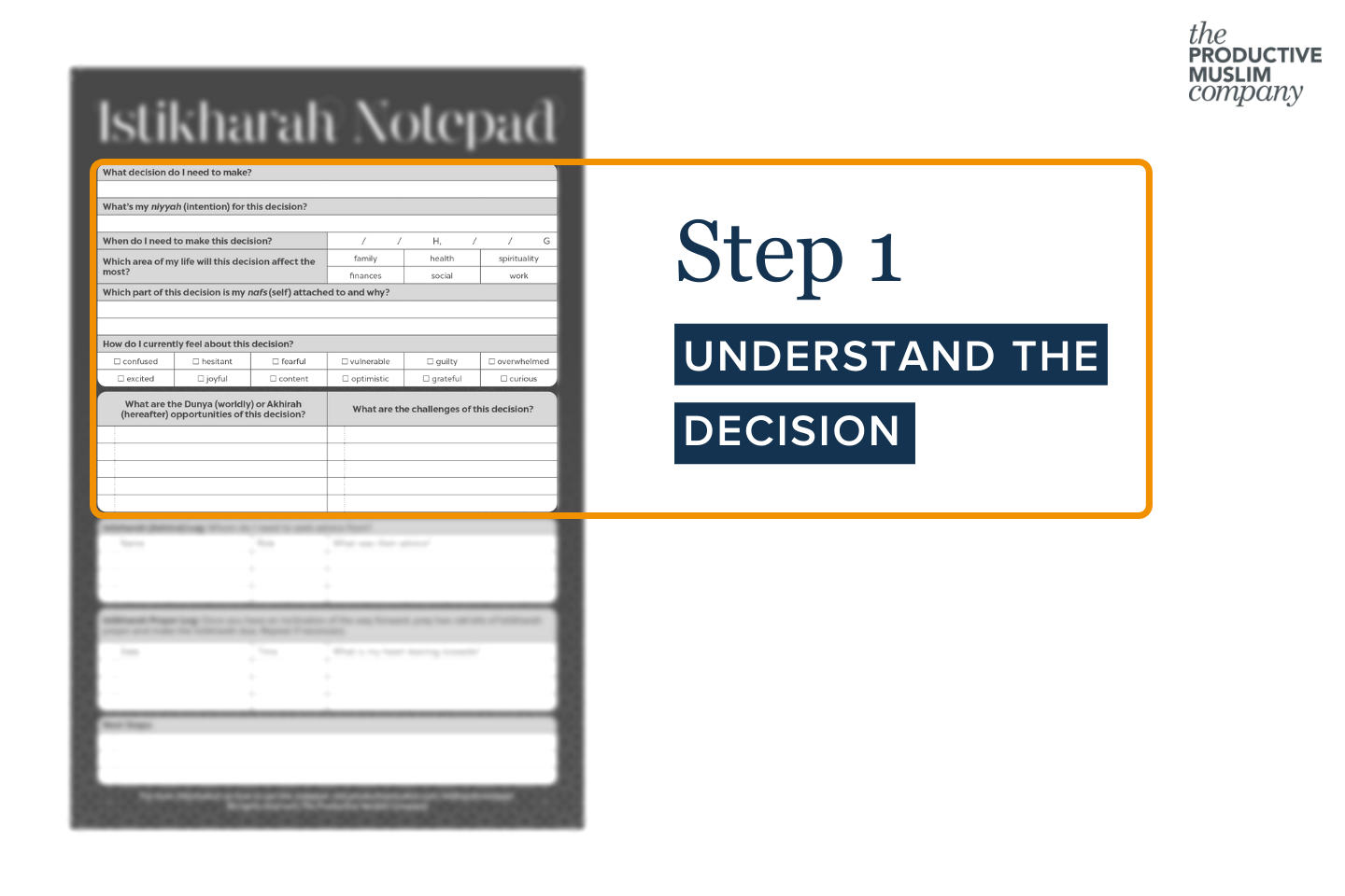The first few questions in the Istikharah Notepad are designed to help you clearly think through the decisions. Here’s a breakdown of each question and how it can help you: