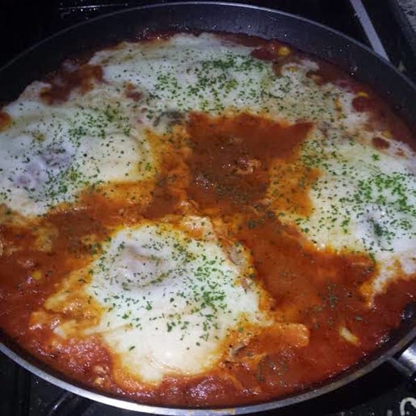 This is a North African dish which is extremely popular, especially in Morocco. It is spicy tomato sauce with meatballs (optional!), topped with eggs. Simple, delicious and full of flavour.