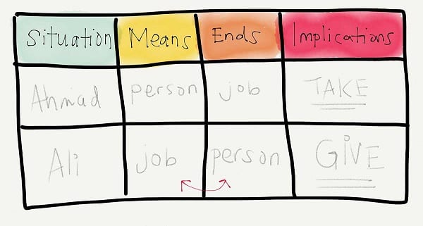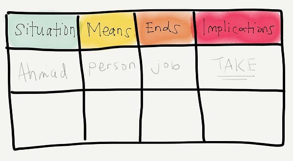 - Draw up the Means and Ends table as shown above (literally or figuratively), with columns indicating the situations, the means, the ends, and the implications of the action.