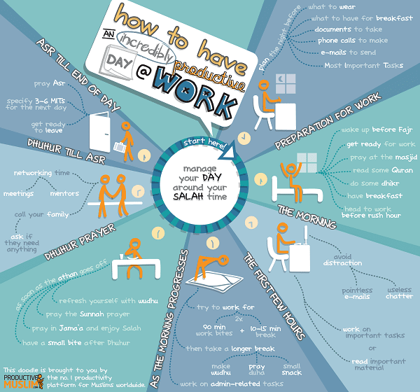 Depending where you work and what your role involves, you will find in this article some useful advice on how to organize your work day to ensure that you have a productive time at your workplace insha-Allah. This doodle is based on the article How to have an Incredibly Productive Day at work by Abu Productive