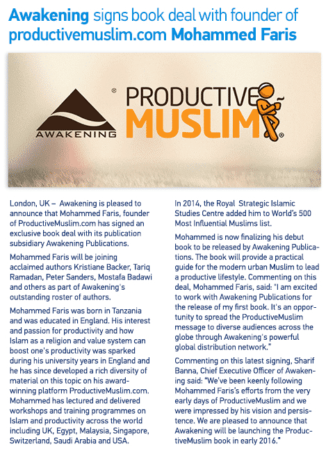 The ProductiveMuslim book is in the final stages now and we were excited to sign a book deal agreement with Awakening Publications, a subsidiary of Awakening Worldwide, one of the leading Islamic media companies in the world today. The book is expected to be released in January 2016 in sha Allah! Look out for new announcements about the book very soon.