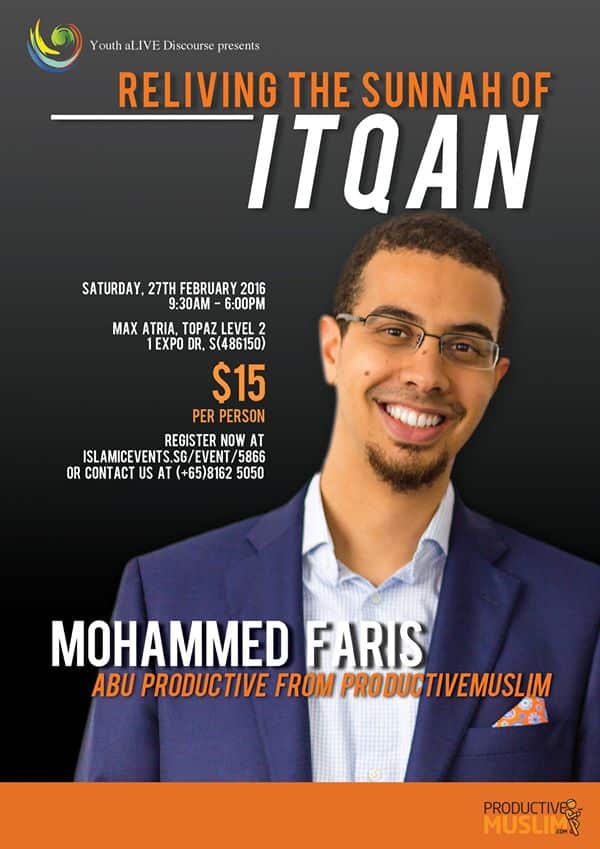 ProductiveMuslim.com is pleased to announce a 1-Day Workshop in Singapore this Saturday, 27th February 2016 in partnership with the Youth aLIVE Discourse Team delivered by the founder of ProductiveMuslim.com, Mohammed Faris (aka Abu Productive)